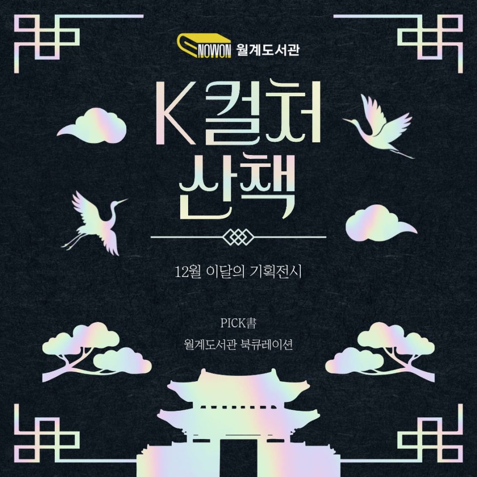 12월 월계도서관에서는 전 세계가 사랑하는 K컬처를 주제로, 한국의 매력을 담은 도서와 음악을 소개합니다. 음식, 전통문화, 유물, 미술, 음악 등 다양한 분야를 통해 가장 한국적이면서도 가장 세계적인 K컬처의 감동을 함께 느껴보는 기회가 되길 바랍니다.